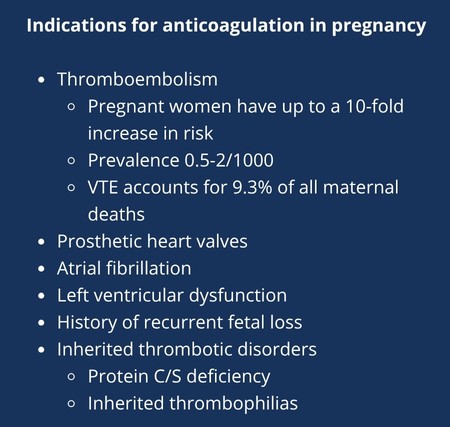 The choice of anticoagulation agent and dosing schedule depends on the indication, as well as the risk versus benefit of the medication to the mother and baby. Unfractionated heparin, low molecular weight heparin and warfarin are the most commonly used anticoagulants in pregnancy.