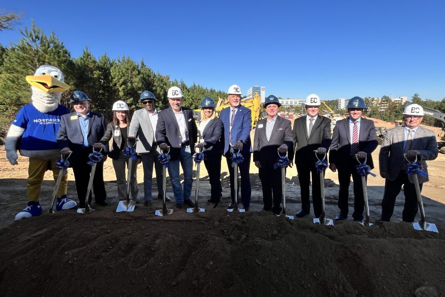 Pictured, from left: Sammy Stork, hospital mascot; District 2 Commissioner Richard Weatherby, Cherokee County; Brandy Jackson, CNO, Northside Hospital Cherokee; Carlos Washington, senior director of facilities management, Northside Hospital; Randy Hall, president and CEO, Batson-Cook Construction; Katie Pearson, COO, Northside Cherokee; Billy Hayes, CEO, Northside Cherokee; Mayor Bill Grant, City of Canton; Adam Bledsoe, director of finance, Northside Cherokee; Charlie Dickhaus, senior vice president and principal, Realty Trust Group; and Dave Domres, vice president of development, Healthpeak.